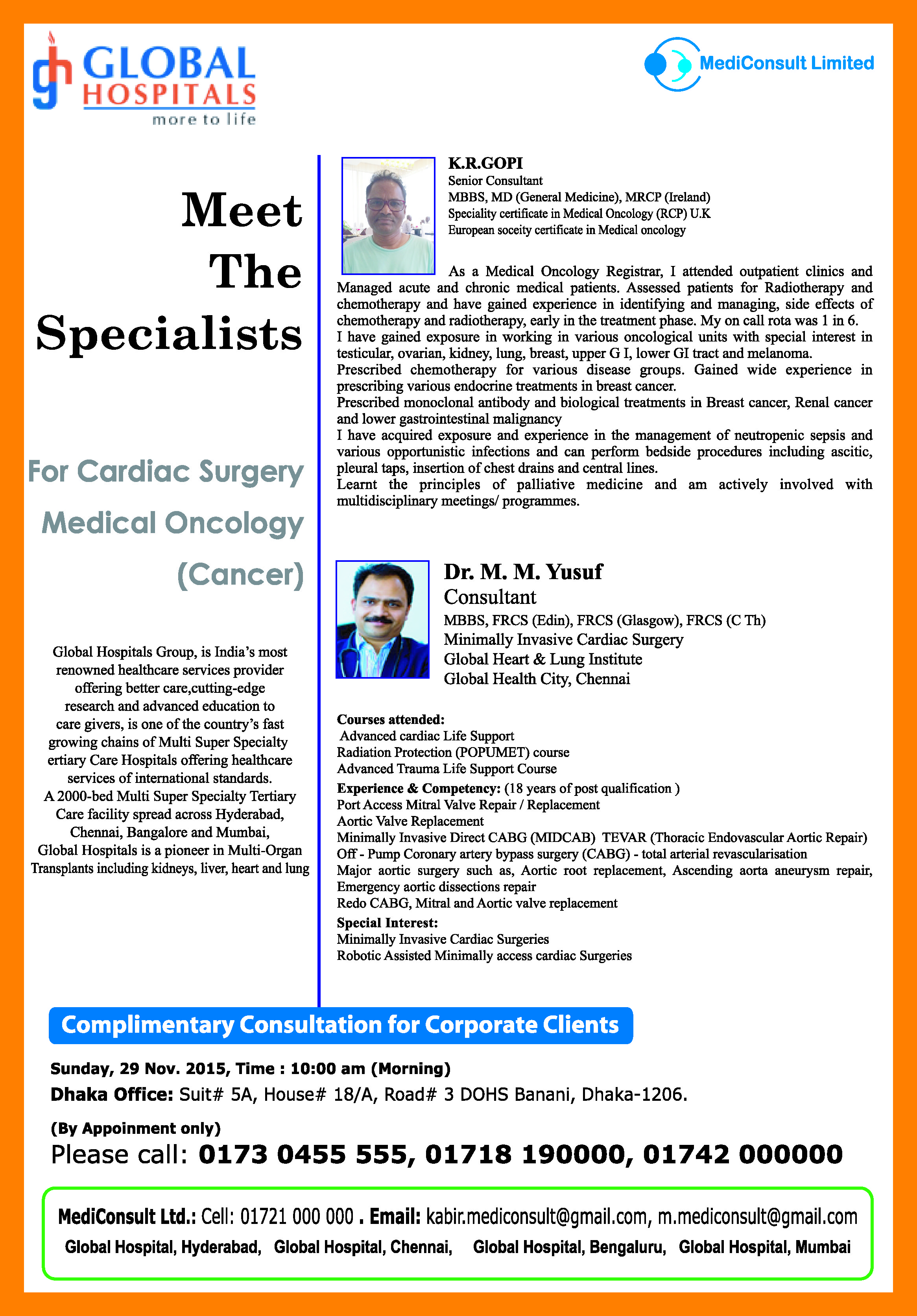 This is to inform you that Dr. K.R. Gopi, Senior Consultant in Medical Oncology & Dr. M. M. Yusuf, Consultant in Minimally Invasive Cardiac Surgery (Cancer), Global Heart & Lunge Institute & Global Health City, Chennai, India will see patient complimentary on 29th November, 2015 Sunday at 10:00 am at Hotel Sarina, Banani in cooperation with MediConsult Limited, Suite # 5A, House 18/A, Road # 3, DOHS Banani, Dhaka-1206. Pls note that MediConsult Limited is one of the enlisted Consulting Firm regarding Hospital & Health Care of BGAPMEA Members.