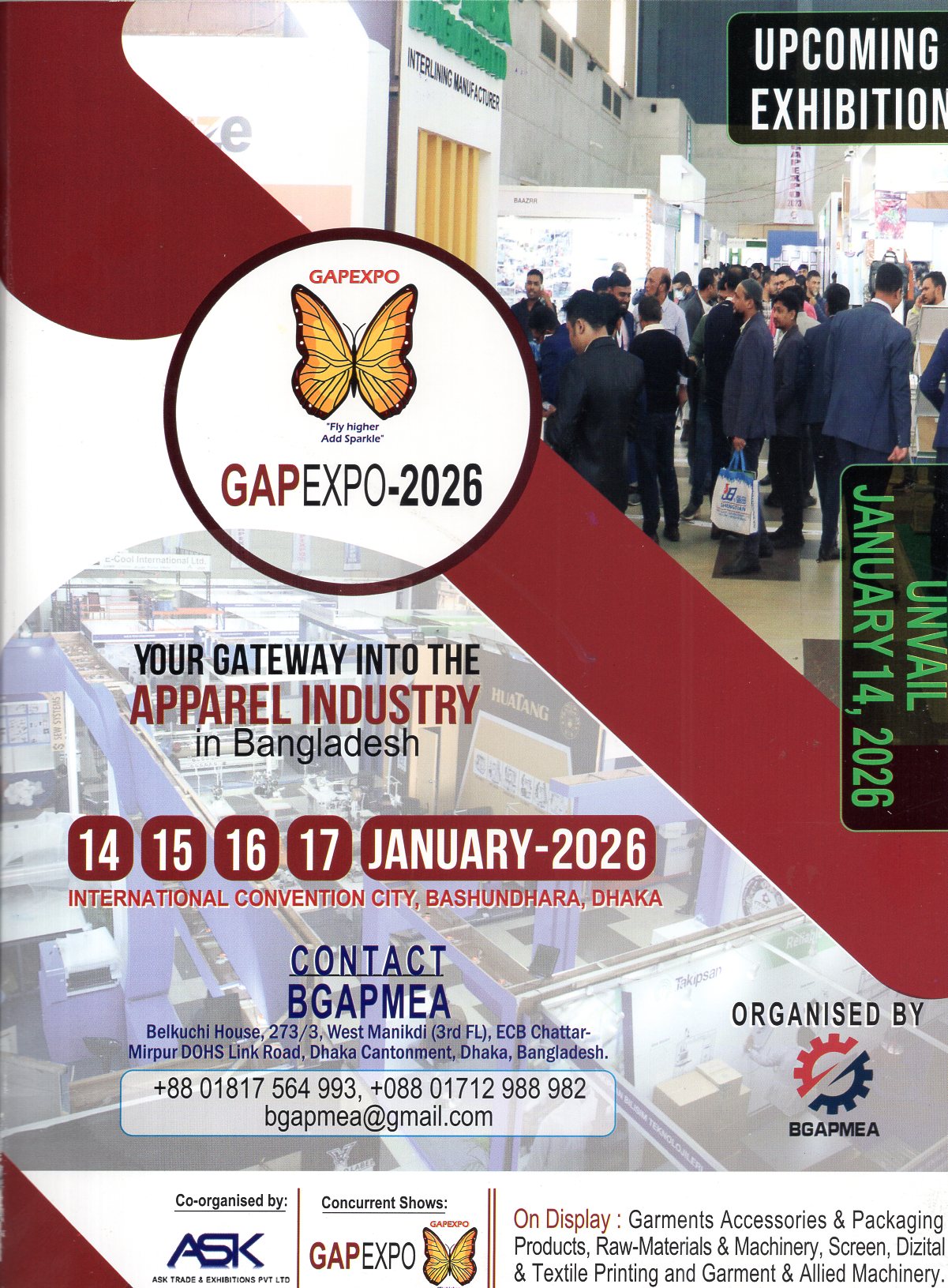 15th International Exhibition namely GAPEXPO-2026 is to be held at International Convention City, Bashundhara (ICCB), Dhaka, Bangladesh from 14-17 January, 2026.